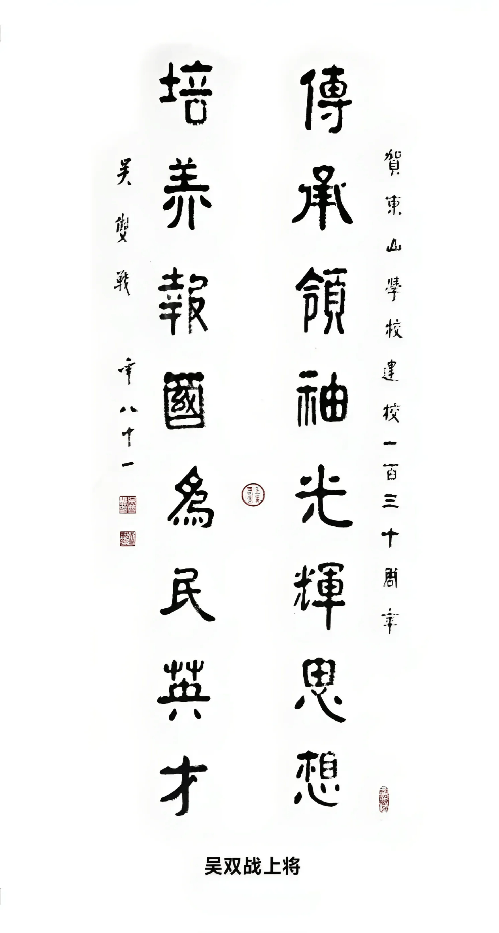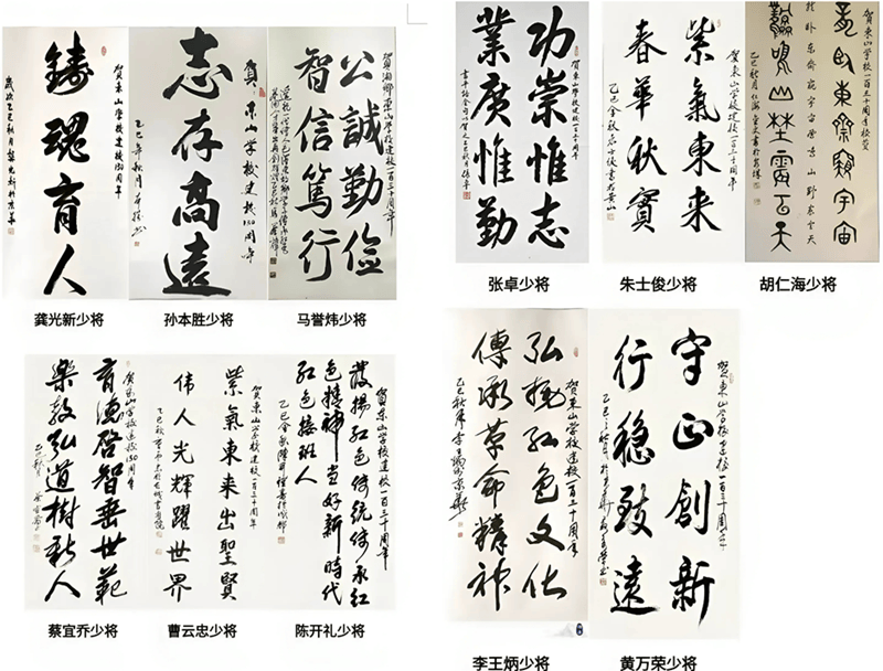 其中,一场汇聚了45位共和国将军墨宝的书法作品展尤为引人注目,成为庆典活动的一大亮点。据将军书法展总策划邓新桥先生介绍,东山学校始建于130年前,自创立之初便秉承“教之以实事,程之以实功”的办学传统,开启了育人育才的辉煌篇章。一个多世纪以来,学校英才辈出,培养了一批为国家发展做出卓越贡献的杰出人物。当这些戎马一生、功勋卓著的老将军们获悉是伟人母校130周年校庆征集作品时,虽时间紧迫,仍怀着对伟大领袖母校和对伟人的深厚情感与崇高敬意,在短时间内欣然提笔,倾情创作,以精湛的书法艺术表达了对学校的诚挚祝贺与深情厚谊。