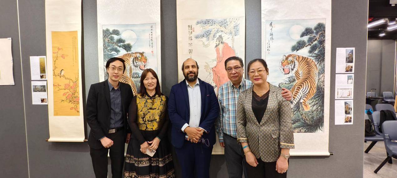 一位在香港长大的印度籍艺术爱好者在画家张淼创作的两幅老虎画《月下雄风-披荆斩棘攀夜峰》前驻足良久,他表示:“我出生于香港,很喜欢中国文化!这些作品既有传统韵味,又充满现代气息,令人印象深刻。”