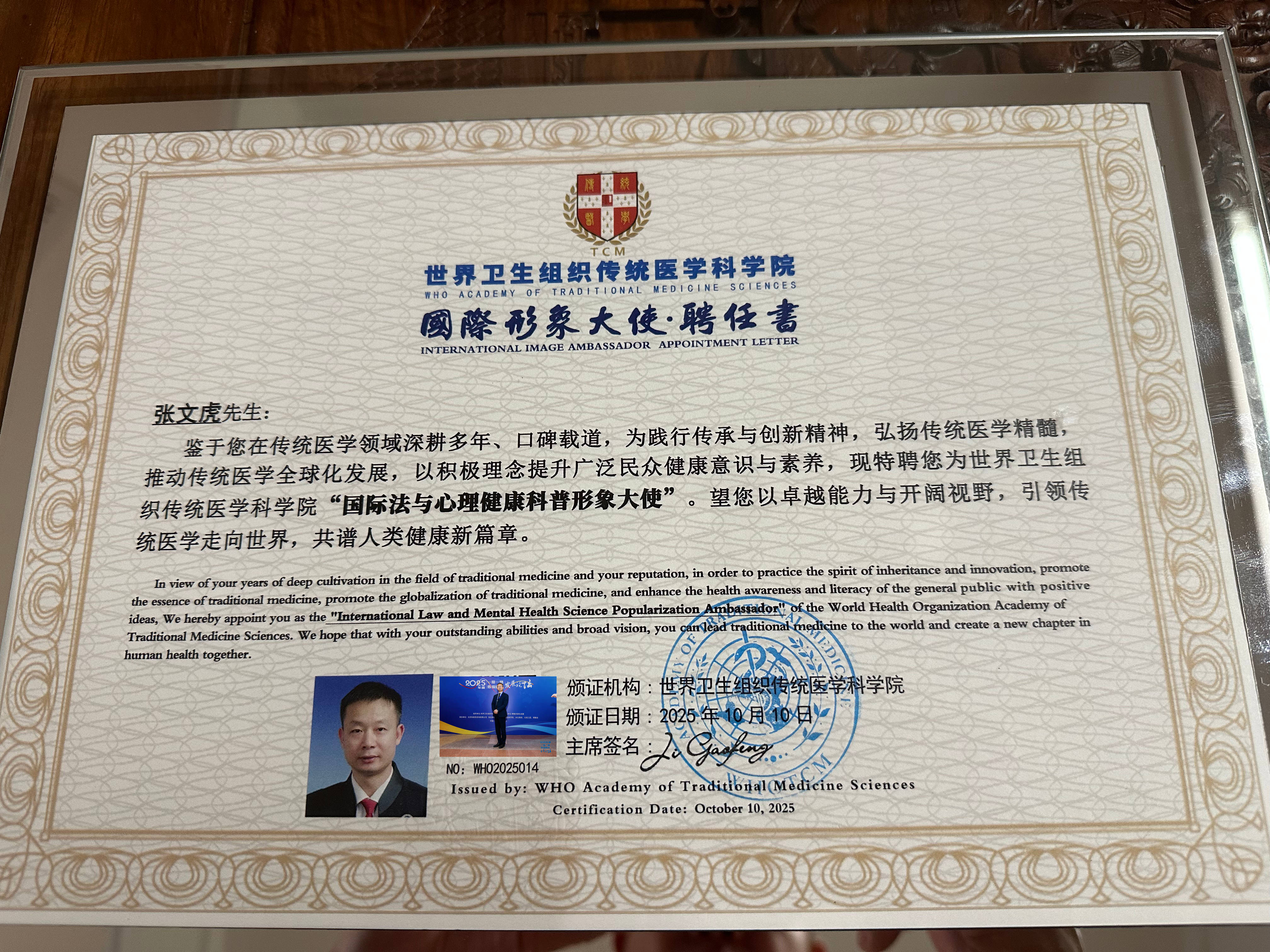 来自浙江的张文虎被世界卫生组织传统医学科学院聘为国际法与心理健康科普形象大使。